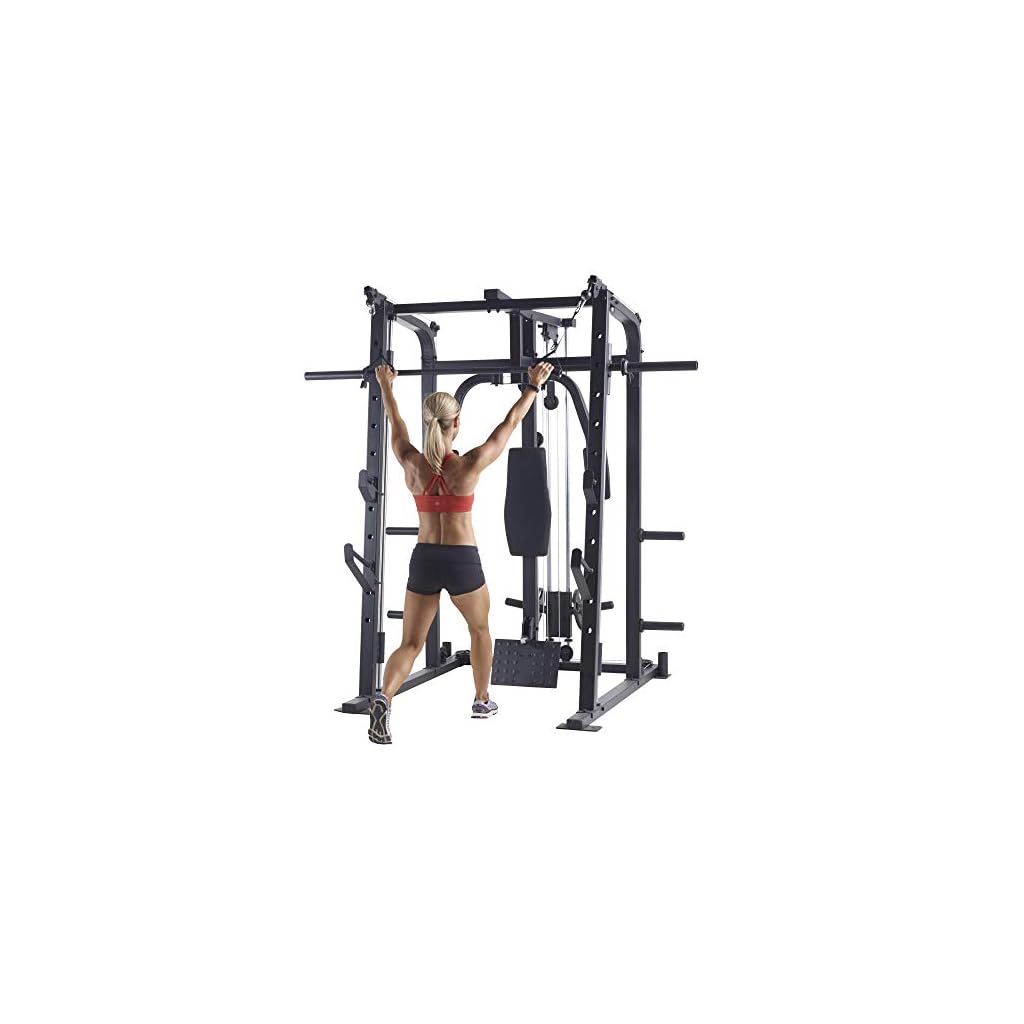 The last product on our list is the Marcy MD-5191 Smith Cage Home Gym workout machine; this is our best overall home gym. Home Gyms are great but most of them really can’t match the full benefits of working out at an actual gym. The Marcy MD-5191 Smith Cage Home Gym workout machine on the other hand brings the gym to your home. It’s a powerhouse offering everything you need to tone and strengthen as if you were at an actual gym making it one of the best overall total body workout home gyms out there. The Marcy MD-5191 Smith Cage Home Gym workout machine is just that, a very serious machine for serious workout or training. With that said we’re not all training for the next Olympics so it’s perfectly fine for light workouts. There’s some serious design enhancement to maximize your workout experience and produce better results for example the frame structure has a nice slant so you’ll find that the upper and lower body movements feel more natural It’s all just well thought-out to give you a great workout experience There’s also several safety features which is great since we’re not all professional trainers and most likely don’t always have a weight training spotter when training. With this gym equipment not that you will need one with this home gym unit. For each area of concern you’ll find safety catches, safety stoppers and non-slip grips or foot braces. The Marcy MD-5191 Smith Cage Home Gym is an ultimate all-in-one Home Gym training system quality-built gym with professional-grade build that meets the demands of serious trainers and offers a wide variety of training options for full body workouts.