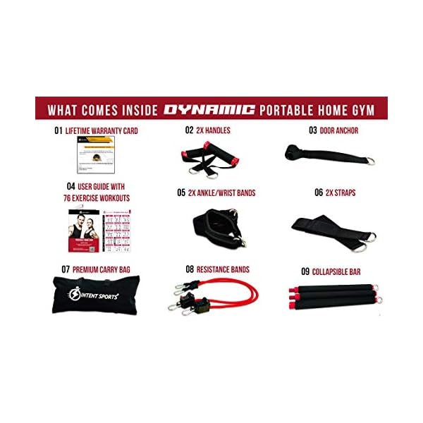 PREMIUM QUALITY & COMPACT DESIGN: Intent Sports Portable Home Gym bundle has a compact design. We designed this product according to quality assurance measurement, it can resist wear and tear and can be with you for a very long time. Every gym comes with a complete package of Start-Up Guide. 76 exercise practical guide and all other important accessories such as two wrist/ankle band, a collapsible bar, door anchor, change bands and a bag.