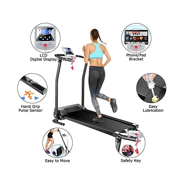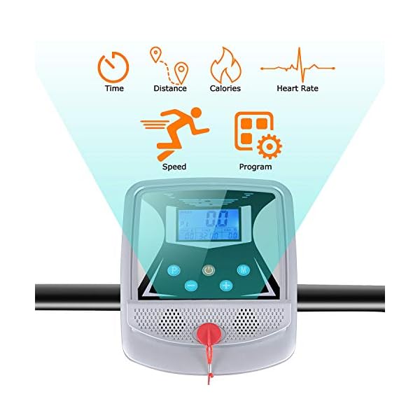 [Big Size LCD Display]: LCD mode: Time, Speed, distance, Calorie, Heart rate, Body fat, Easy-Self lubrication, it also as a Ipad/mobile phone holder that you can talk with your friends or watch movies when you work out on this treadmill.