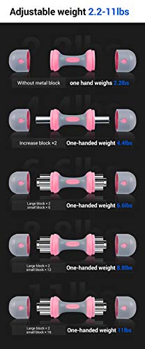 MULTI-WEIGHT SETTING: The dumbbell alone weighs 2.3 lbs. each. Weight bars are included to allow you to adjust the weight of your dumbbell. There are 16 small and 2 large weight bars per dumbbell. The small bars weigh 0.4 lbs. each and the large bars weigh 1.25 lb. each. In order for the sides to be even, you should add them equally on each side. The lowest weight is 2.3 lbs. and the highest weight is 11.2 lbs. per dumbbell.