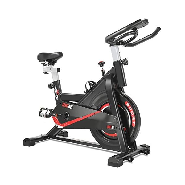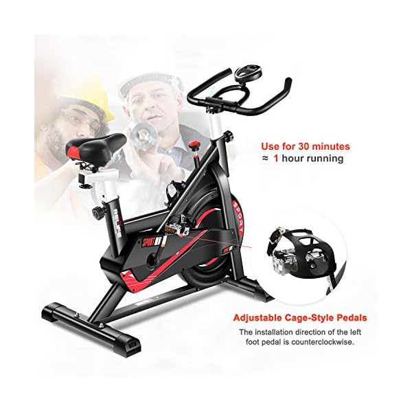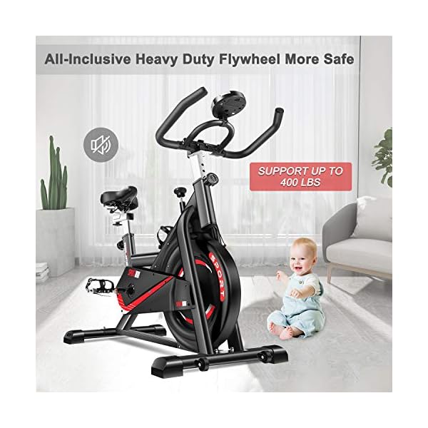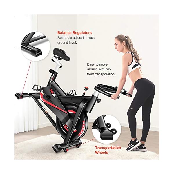 💪ăSAFE TO EXERCISEăErgonomic design with all-inclusive flywheel, ensure enough safety to keep away from contact and injuries around children. The adjustable cage pedals on spinning bike protects you from a fast ride, press the resistance bar to stop the flywheel in an instant. Transport wheels let you easily move this cycle machine.