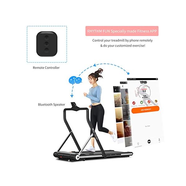 4. 【Bluetooth Speaker, Smart workout APP & Remote Controller】:—-RHYTHM FUN treadmill can also be connected phone with bluetooth, play music when running & walking , or watch TV by treadmill phone holder. Also,you’ll easily monitor and track your workout on smart workout APP & remote controller, setting a wide variety favorite trainning program freely.