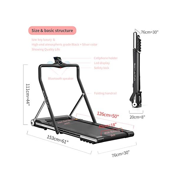 1. 【2-in-1 Fitness models treadmill】 :—Walking & Running treadmill. Unlike normal treadmill, RHYTHM FUN treadmill can be utilized 2 ways.when treadmill handrail folded, it becomes to under desk treadmill or standing desk treadmill, you’ll walk whilst you work with the speed max to 3.7mph=6km/h. when handrail put up,you’ll running as typically with speed max to 7.5mph=12km/h.