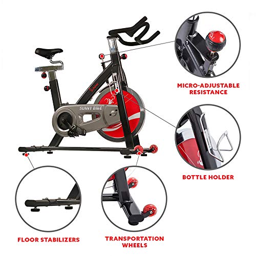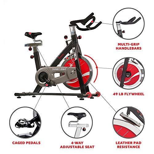 Sunny Health & Fitness Indoor Stationary Exercise Bike, 4-Way Adjustable Seat for Cycling Cardio workout at Home, Optional 49 LB Flywheel, Heavy-Duty & Free SunnyFit App Bluetooth Connect